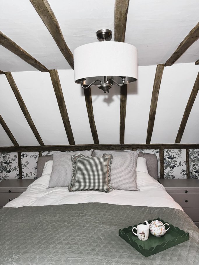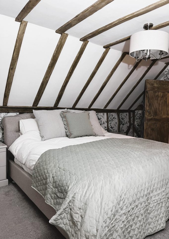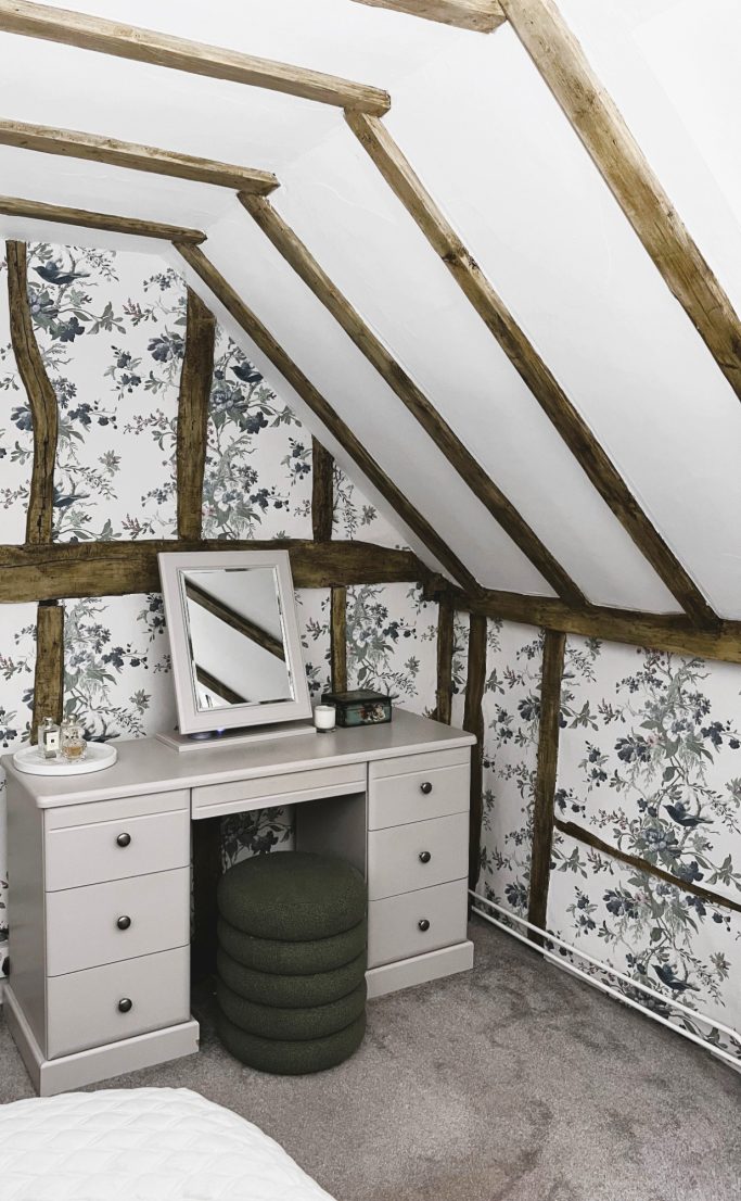 In the master bedroom, floral wallpaper was a key inspiration, softening the exposed beams and creating a gentle dialogue between old and new. A cosy bed tucked beneath the eaves, dressed in crisp white linens, soft grey pillows, and a quilted green throw, echoes the palette and pattern, tying the space together with quiet elegance.
