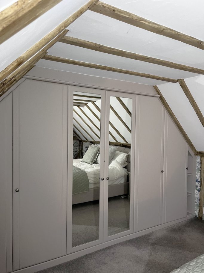 Storage was essential, so a built-in mirrored wardrobe was designed to make the most of the sloped ceiling. The mirrors reflect natural light and visually expand the room, while open shelving adds both function and flair.