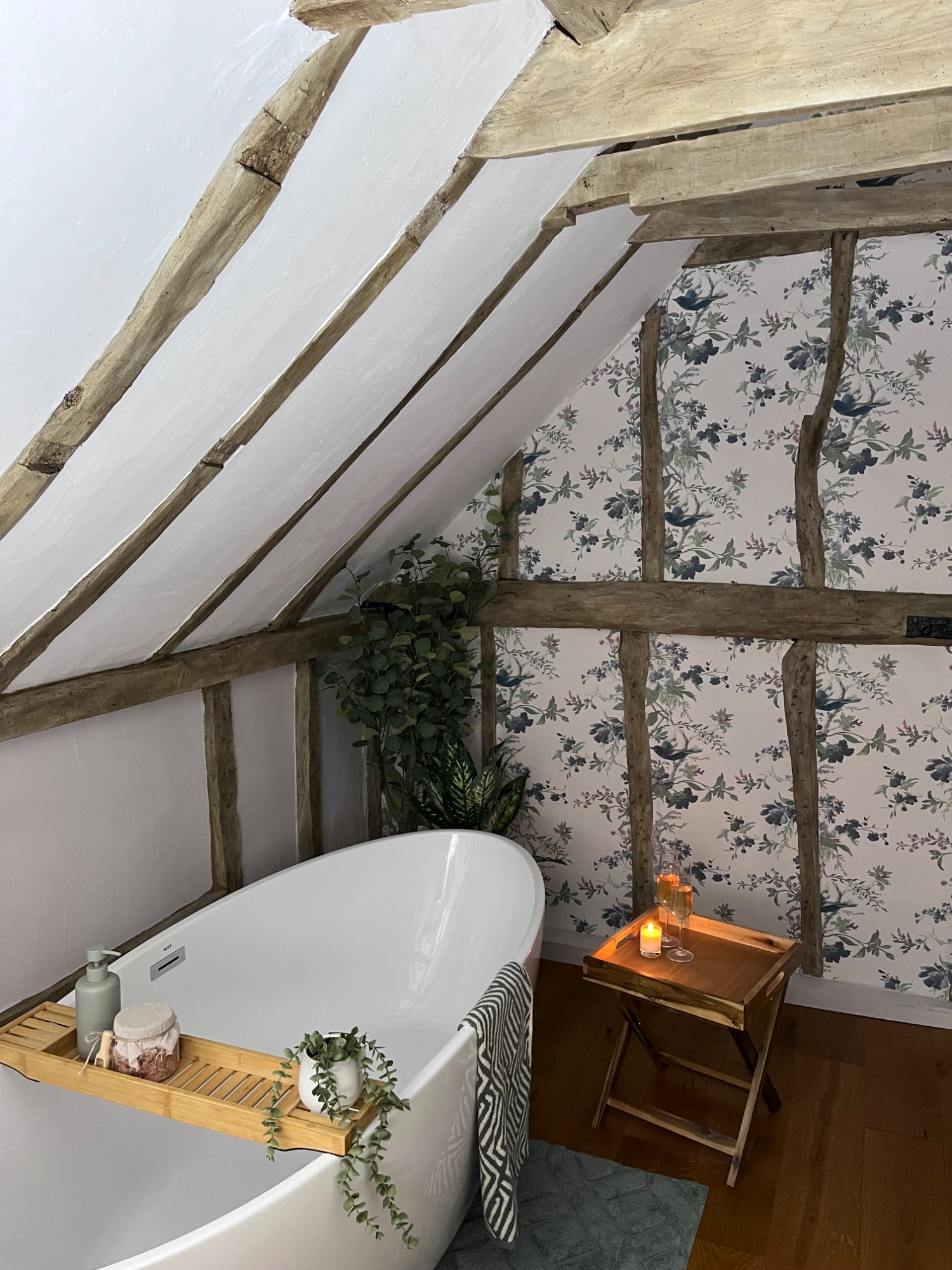 The ensuite continues the story with a freestanding tub nestled under timber beams, offering a spa-like sanctuary. The floral wallpaper reappears here, framed by woodwork to create continuity and a touch of vintage romance. Candlelight, greenery, and thoughtful styling evoke a sense of intimacy and calm.