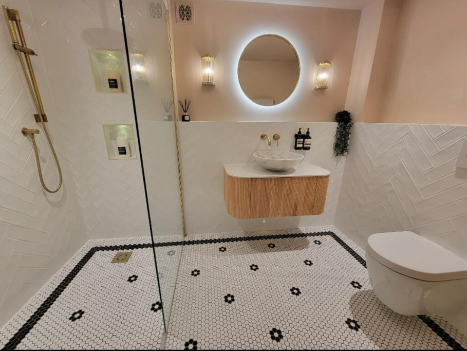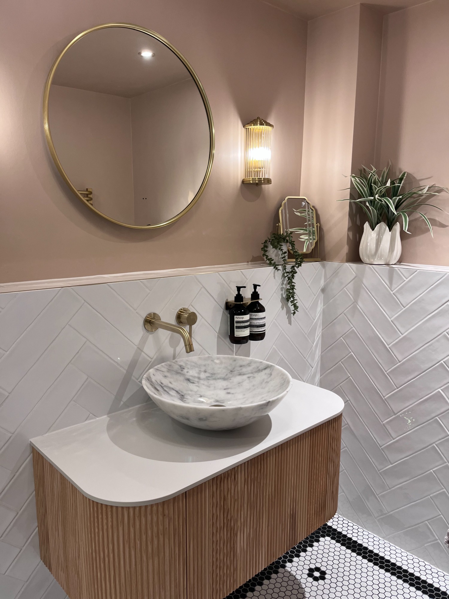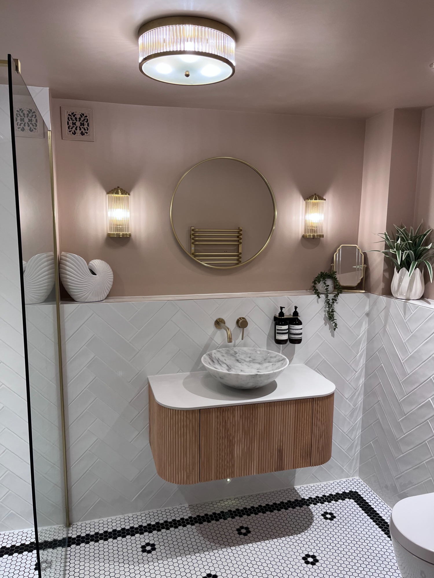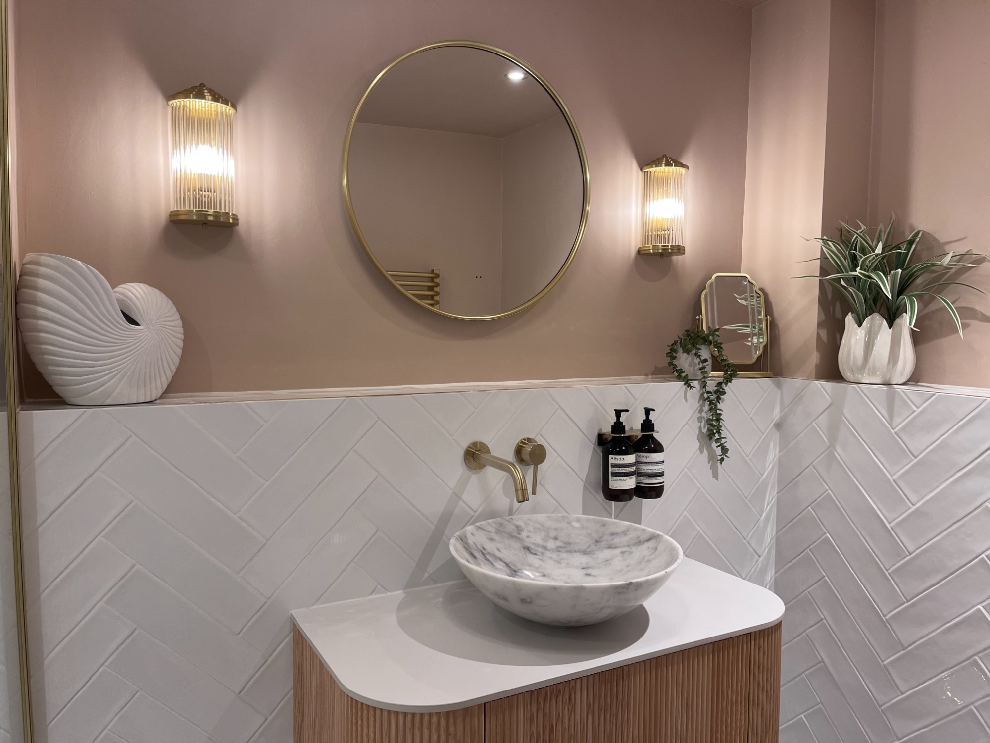 The new design centres around soft pink walls paired with white herringbone tiles, creating a fresh and uplifting palette. A floating vanity with a curved wooden front and marble basin adds sculptural interest, while ribbed glass sconces and layered mirrors bring depth and sophistication.