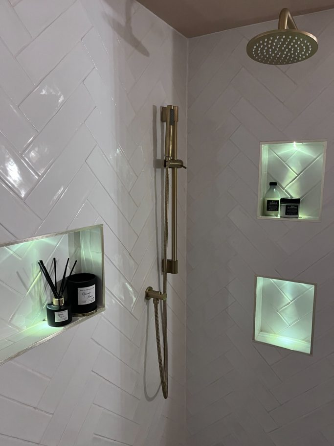 In the shower, illuminated recessed shelves offer both function and atmosphere. Brushed brass fixtures elevate the space with a touch of luxury, contrasting beautifully against the crisp tilework.